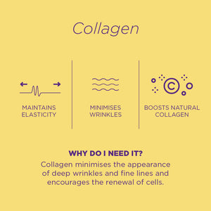 Collagen maintains skin elasticity and strength by stimulating the synthesis of new collagen and, as a result, minimising the appearance of deep wrinkles and fine lines. Collagen encourages the renewal of cells and minimises facial muscle contraction, the cause of wrinkles.