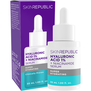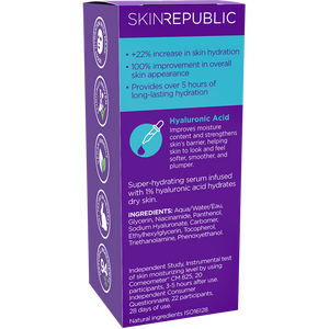 Super-hydrating serum, infused with 1% hyaluronic acid. Deeply hydrates dry skin, soothes rough patches, flaking and dryness. Skin feels super soft and intensely hydrated.